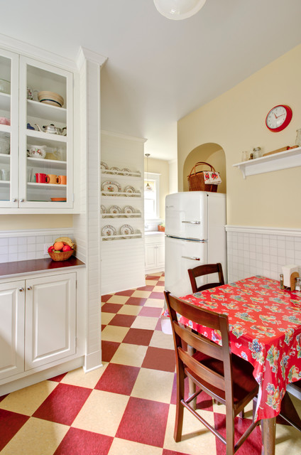 Inspiring Vintage Kitchen Designs This beautiful kitchen melds reclaimed building materials, architectural elements, and vintage graphics in innovative ways. Tin details spark interest on the ceiling and above the range. Chip-painted boards create an inexpensive, high-impact backsplash, while corbels support the island's breakfast bar. Flashback in time with our 1950s Formica retro kitchen table and chairs. These retro dinette sets are reproductions of the retro tables and chairs that were made in the 50s. High commercial quality materials are used such as chrome edges bases and legs, Formica tabletops, and top-grade vinyl chairs. These vintage tables and chairs are sure